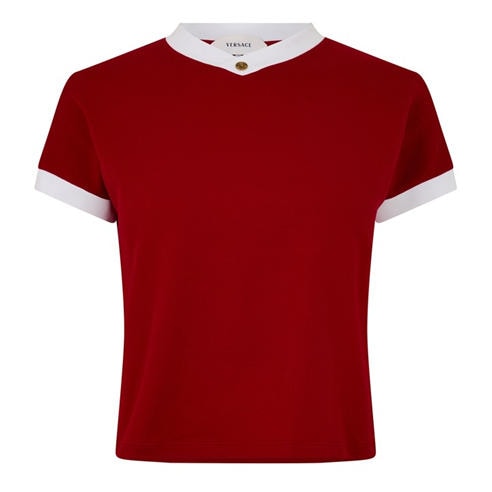Fill your casual wear wardrobe with the staples with this season's collection of Versace t-shirts and tops for men, women and kids. Discover the brand's bold graphics embedded throughout the finely crafted pieces including the iconic medusa head, coin motifs, grecian detailing and baroque pattern. Make a statement in a logo embossed t-shirts with a gold foil effect, cropped tees, and classic short or long sleeve t-shirts in relaxed silhouettes. For a smart casual ensemble opt for a polo shirt or take it up a notch with figure enhancing bodysuits, chic bralets and dressy corset tops. Shop the Versace t-shirts and tops edit with a strong use of a monochromatic colour palette and rich gold hues or opt for pops of pink and blue to brighten up your look.